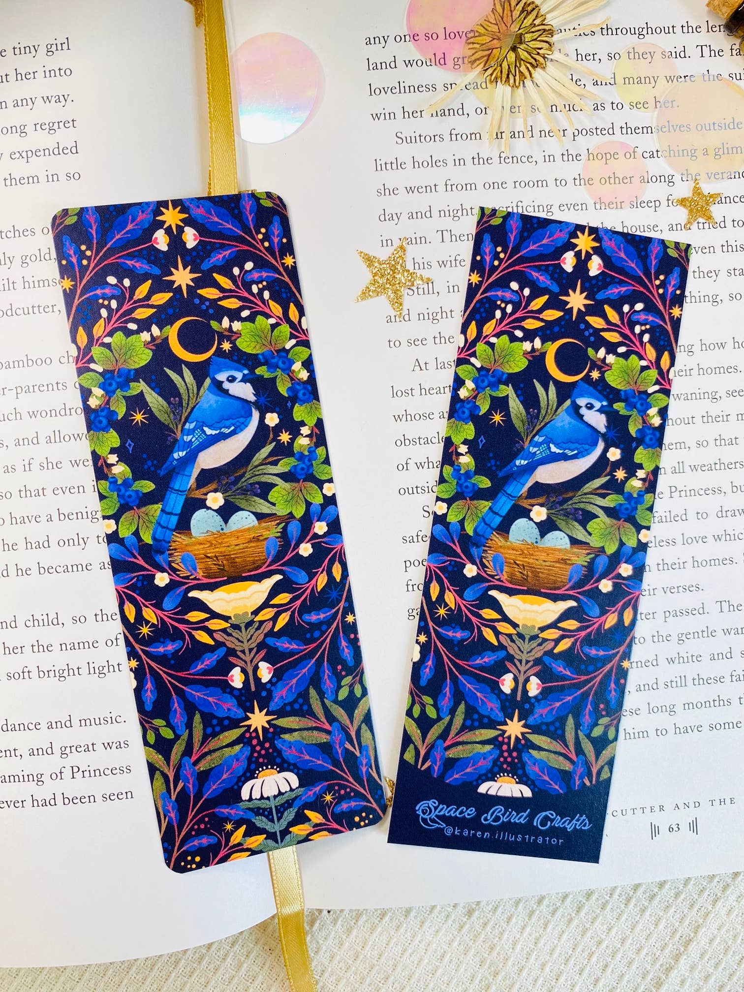 Das Lesezeichen ist doppelseitig. Die Vorderseite ist vollständig bebildert. Auf der Rückseite steht unser Etsy-Name und unten unser Instagram-Konto.