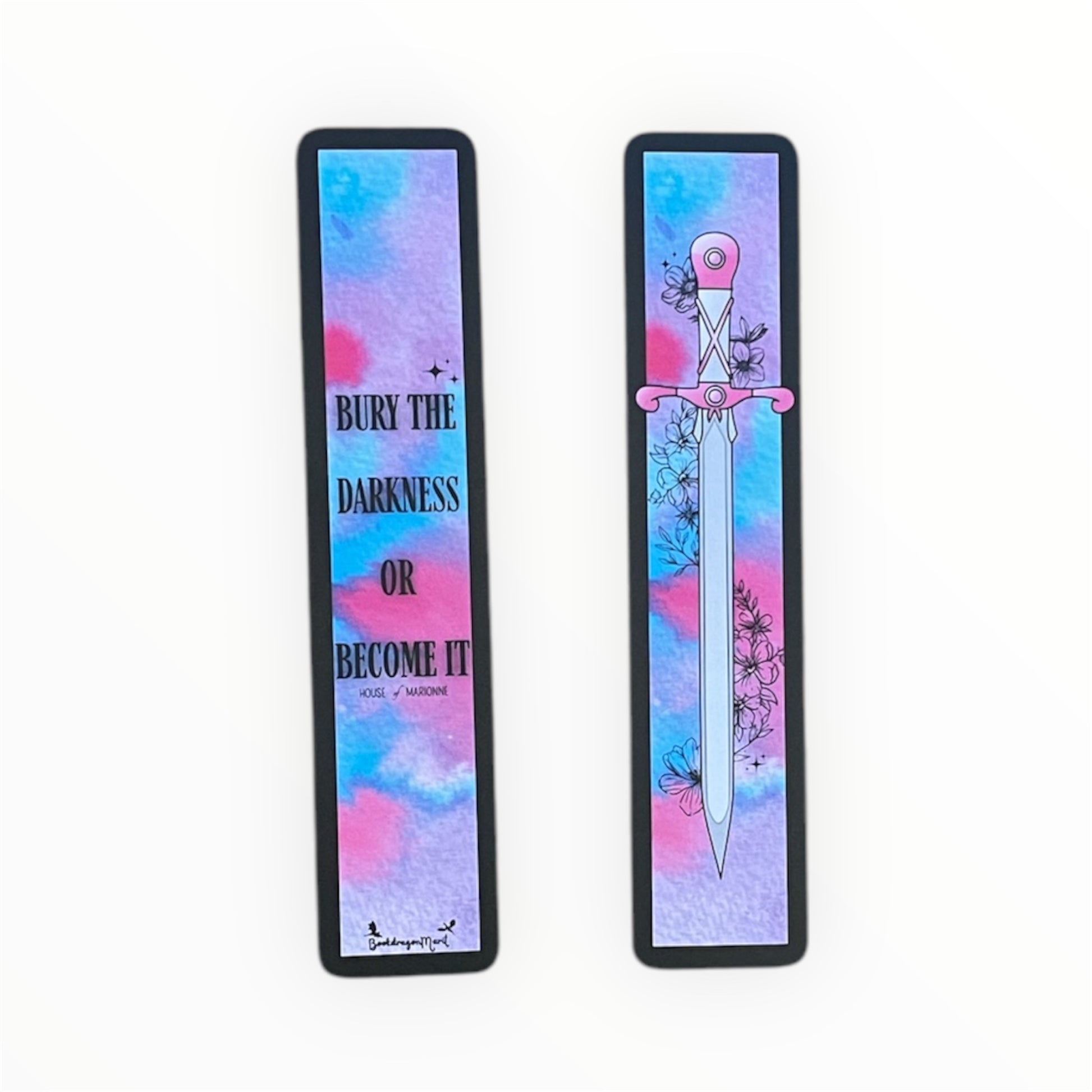 Dieses coole Lesezeichen wurde 2023 exklusiv von Bookdragonmarit für unsere September Book Box entworfen, ganz im Stil des Buches „House of Marionne“ der Autorin J. Elle. Auf der Vorderseite ist ein wunderschönes Schwert bedruckt, die Rückseite ist mit einem Zitat verziert.