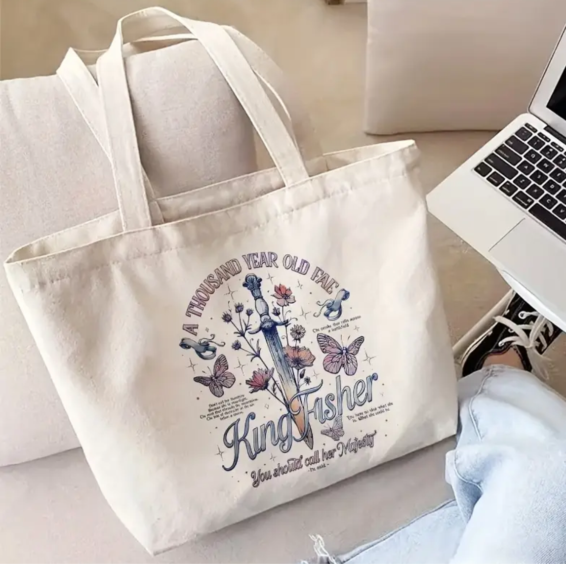 - Design: Betoverende print met vlinders, bloemen en een zwaard, vergezeld van de tekst “A Thousand Year Old Fae – Kingfisher”.