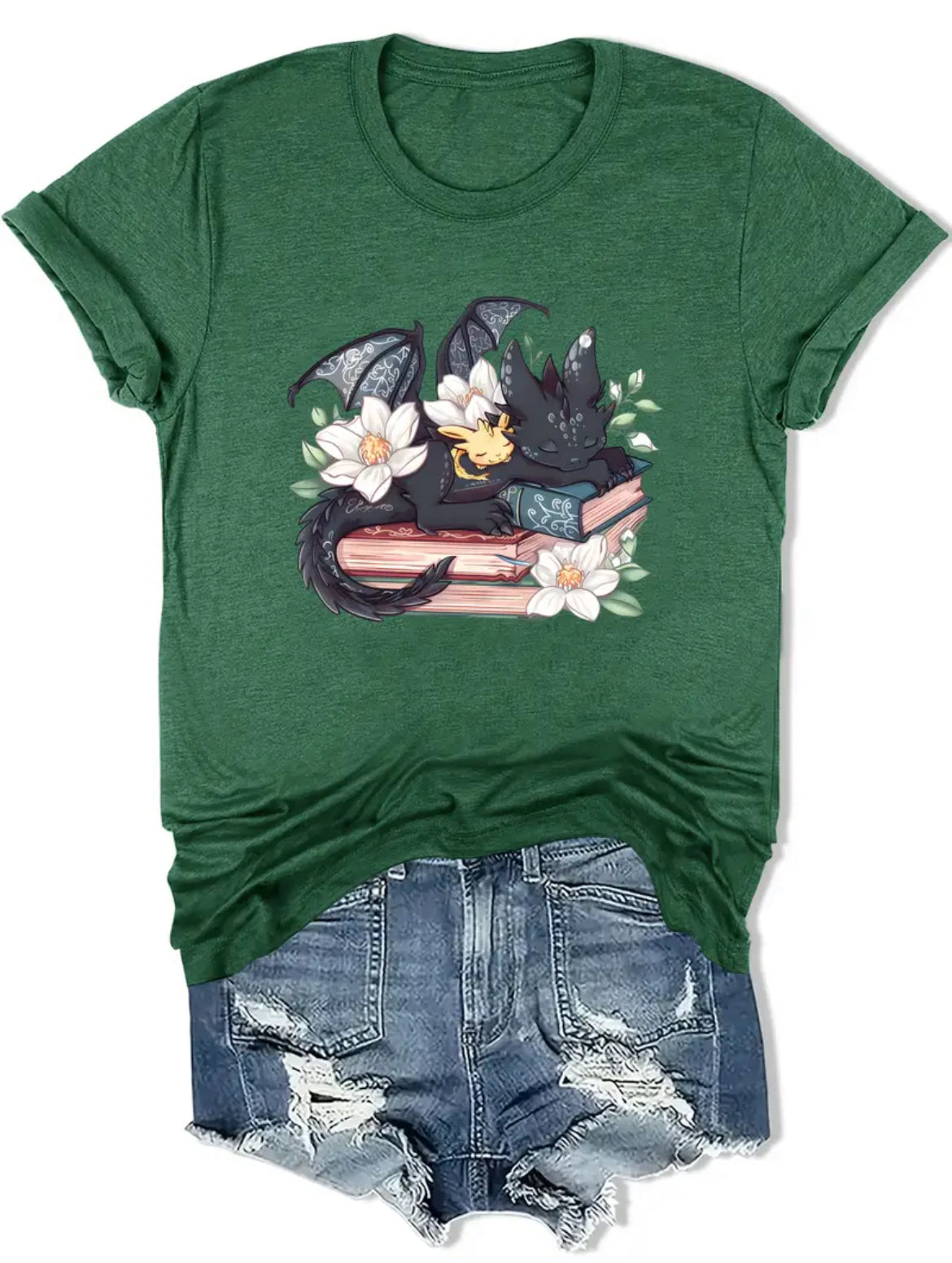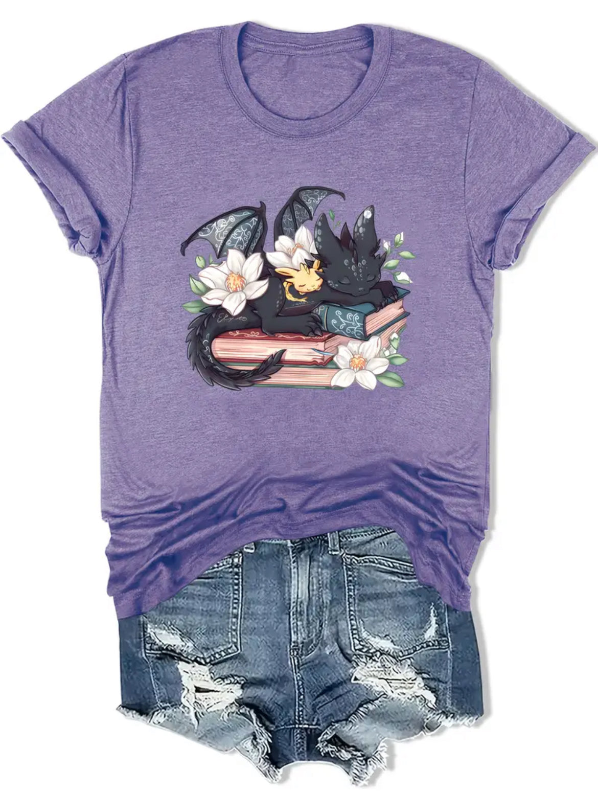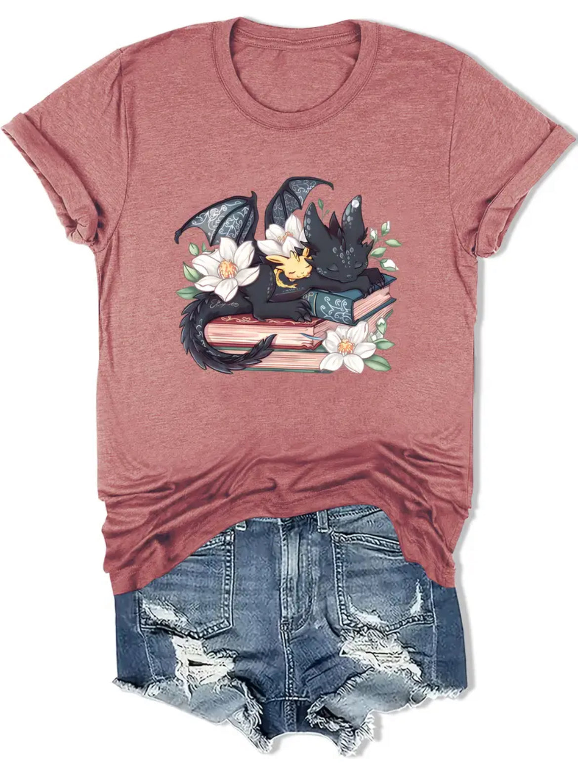 Laat je hart smelten met dit betoverende T-shirt waarop een schattige zwarte draak vredig ligt te slapen bovenop een stapel boeken, omringd door bloemen. Perfect voor fantasyfans, gamers én boekenliefhebbers.