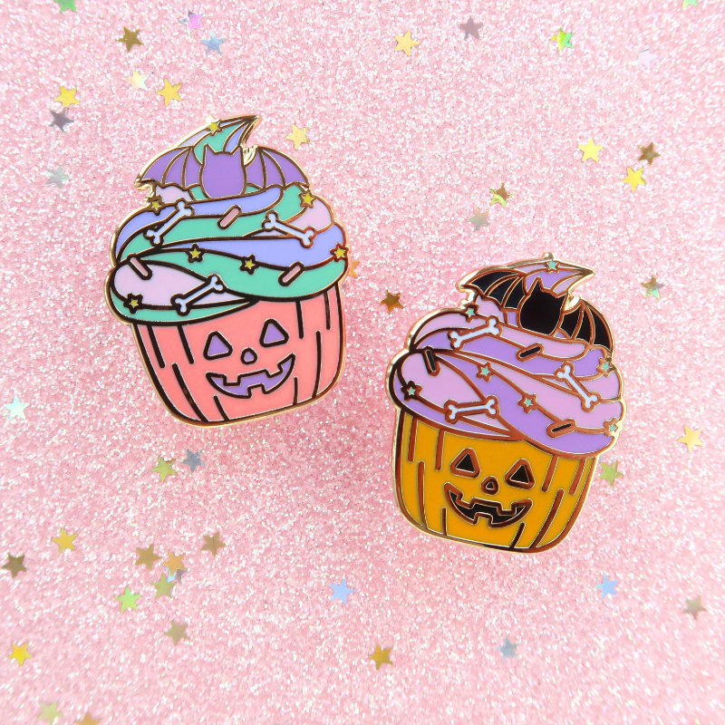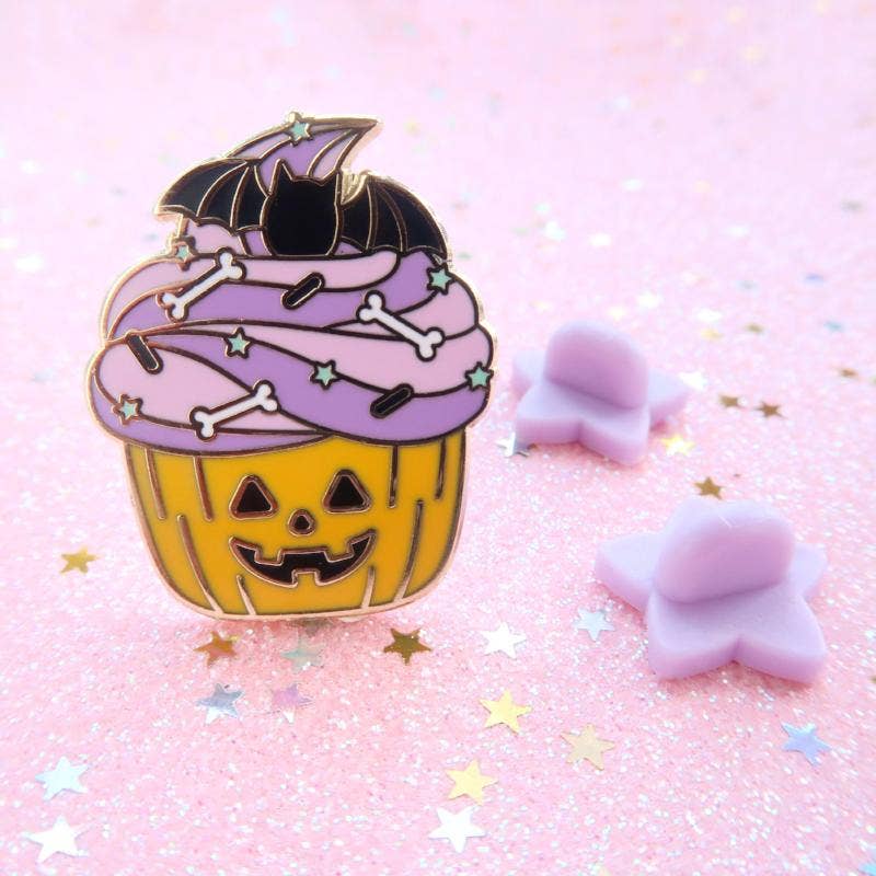 A spooky yet cute and delicious looking cupcake enamel pin just for Halloween.